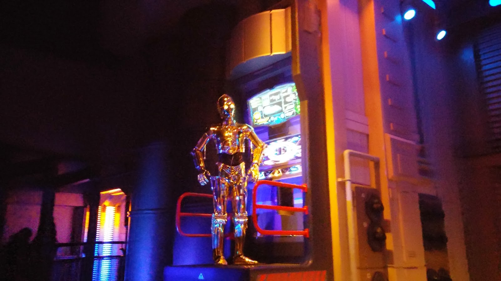 I didn't know what to expect, but the queue itself was wonderful. It really set the theme and genuinely felt like we were going on a little trip. There's a customs desk where you get scanned (with a clever little thermal imaging camera setup so you can see yourself. Nice touch!) as well as Arrivals and Departures boards dotted around, and signs written in Aurebesh.