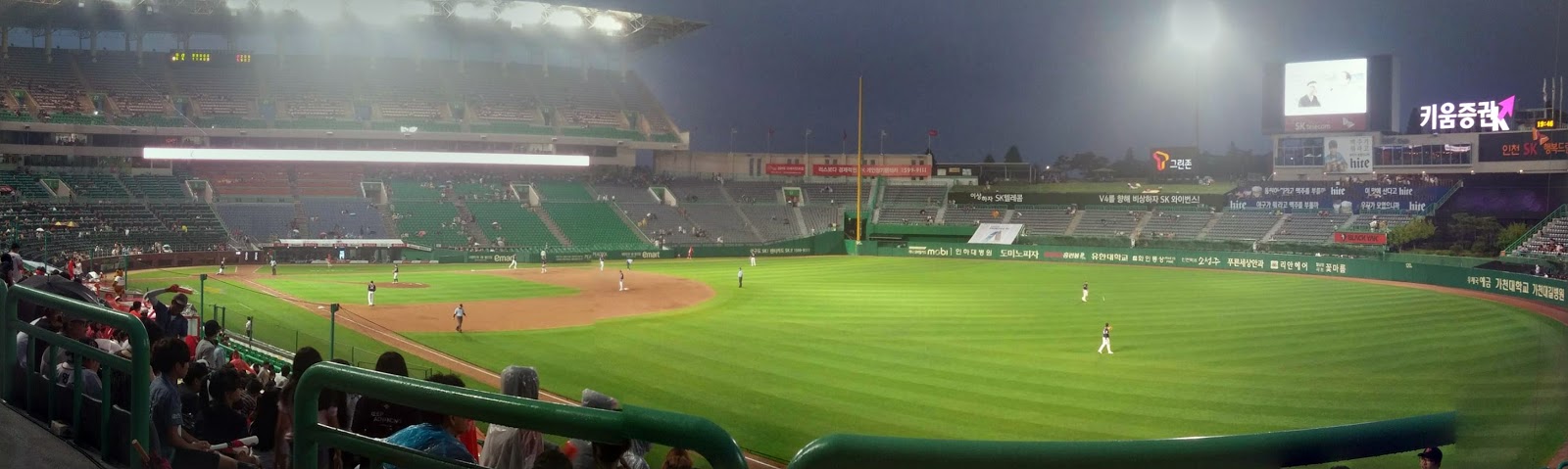 I dunno if it's just the Korean style, but it was a lot to take in. A huge TV screen kept blaring noise and showing us various numbers that I'm assuming mean something to anyone that knows what they're actually looking for, rather than an impostor that came to eat chicken. We noticed both teams seemed to have a token foreigner, which was amusing, and used the aformentioned rudimentary rounders knowledge to work out who was batting and who was fielding. But we weren't sure which team was which, or which team's area we were sat in. So we just cheered for everyone.